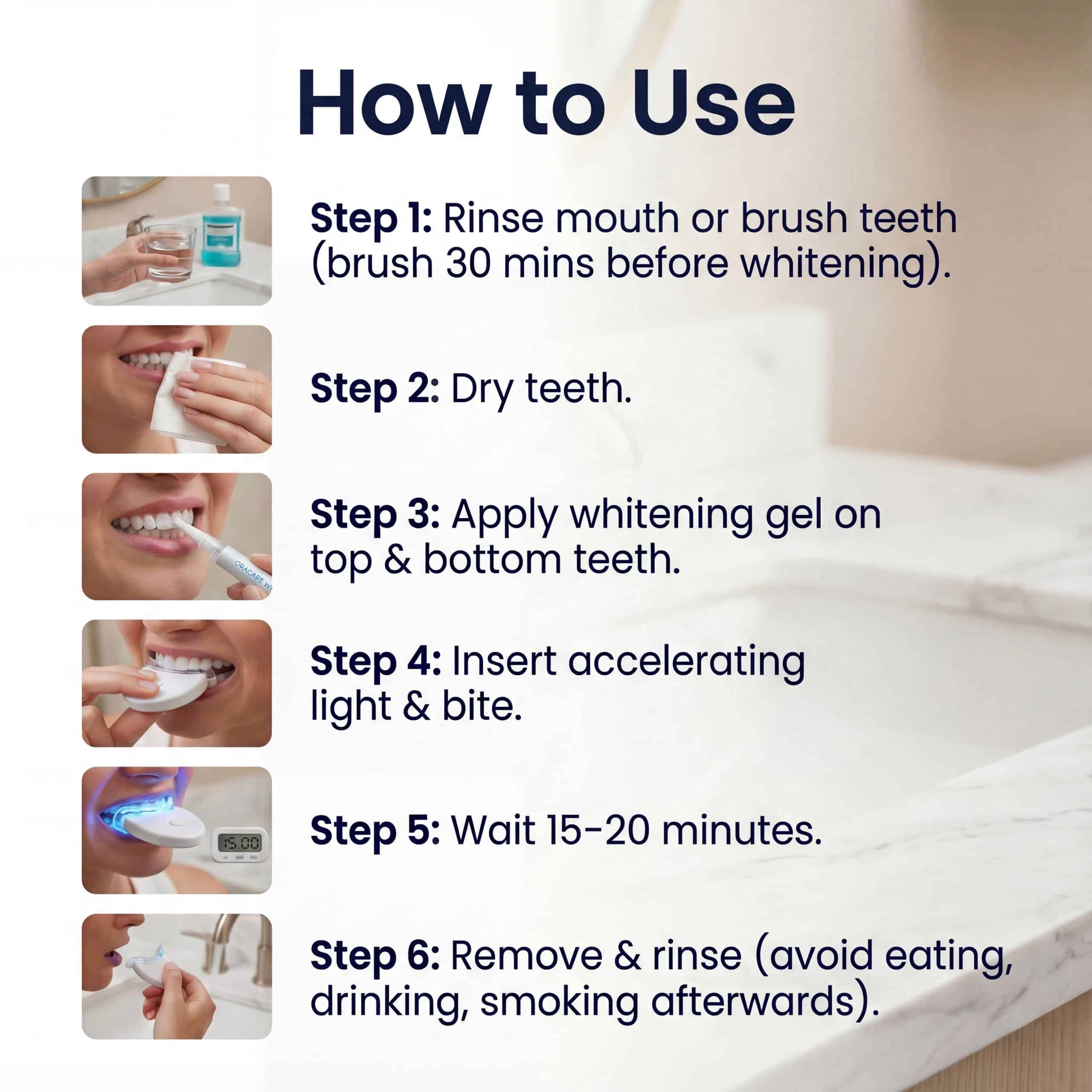 How to Use: Brush and dry teeth, apply a thin layer to front surfaces, activate with LED light, rinse after use