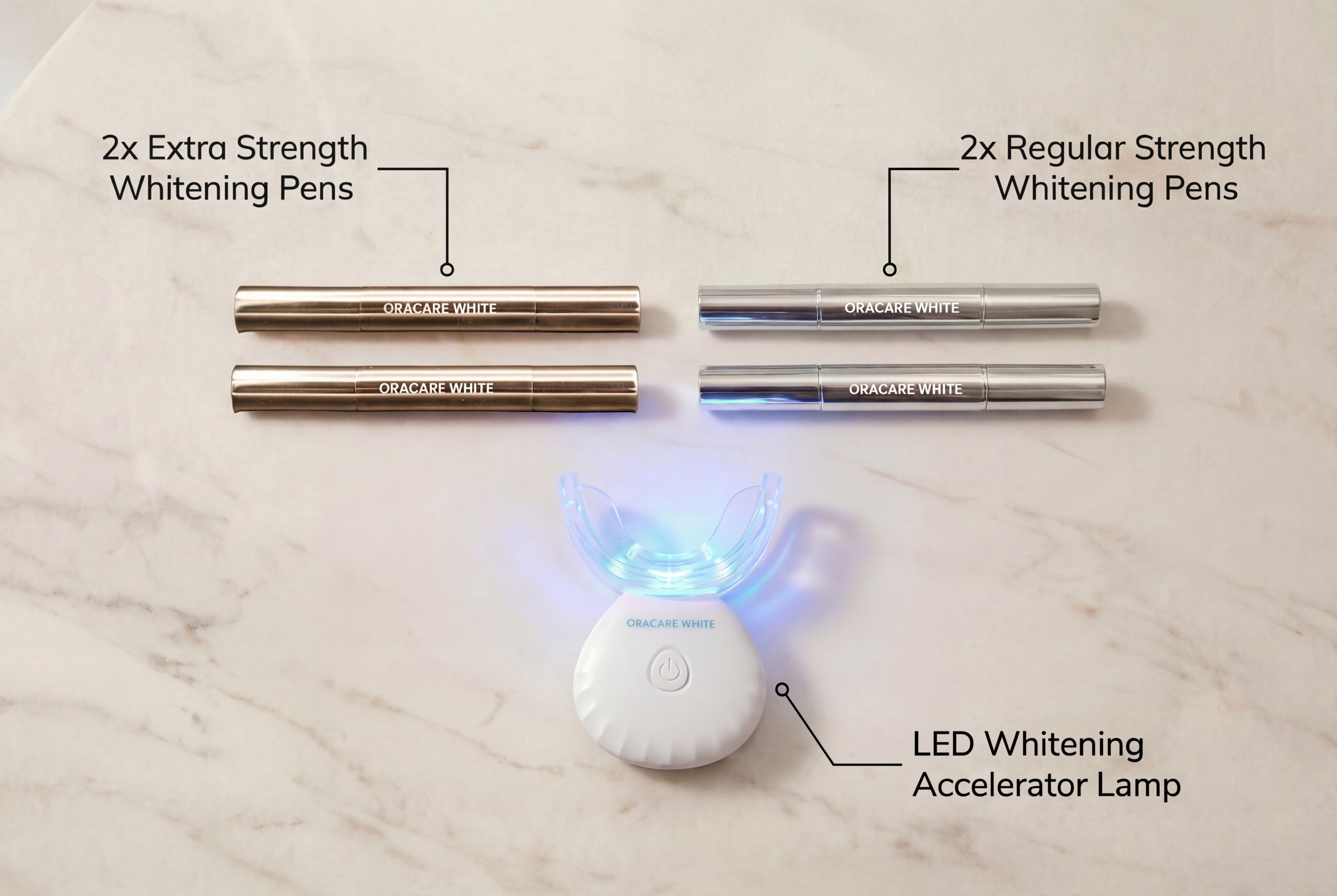 The Oracare White Regular Whitening Kit offers a gentle but effective at-home treatment for a noticeably brighter smile. This balanced-strength system combines Carbamide Peroxide 35% and Hydrogen Peroxide 6% to lift stains while staying sensitivity-conscious. Ideal for first-time users or anyone maintaining a whiter smile, the LED accelerator light enhances performance for consistent shade improvement with daily use.